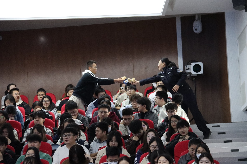 活动采用了“案例剖析+情景模拟+知识竞答”的多元化宣教模式:民警们通过演绎“冒充客服退款”“网络交友诱导投资”等情景剧,生动还原了诈骗场景,并邀请学生上台亲自拆解诈骗套路;同时,活动还设置了“安全知识抢答”环节,围绕反诈、反邪教、网络安全、禁毒等核心主题展开激烈抢答,优胜者获得了精心准备的定制礼品。学生们纷纷表示:“以前总以为国家安全离我们很遥远,今天才深刻认识到,守住个人信息、拒绝不良信息同样是在为守护国家安全贡献力量。”